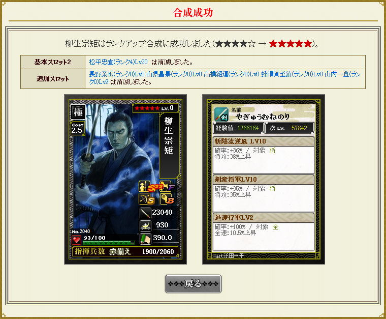 剣豪としては最も成長が遅れていた倅の宗矩がやっと★5に昇格することとなった。