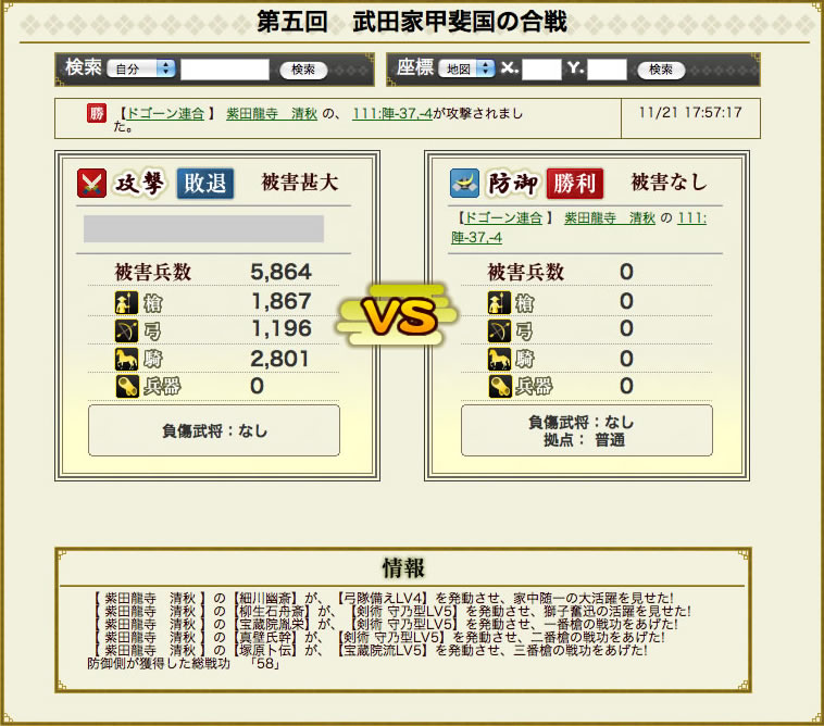 むう、防衛成功である!結果として当方の被害は0、武将の方々の体力も29しか消費されていなかった。戦功からすると、相手は間違いなく上級兵ではない。では中級兵なのであろうか?武将の方々の体力消費具合からすると当方の防衛力は相手の2倍に相当するという事になる。という事は、今回の2倍の兵力までは担当する能力があるということじゃな。