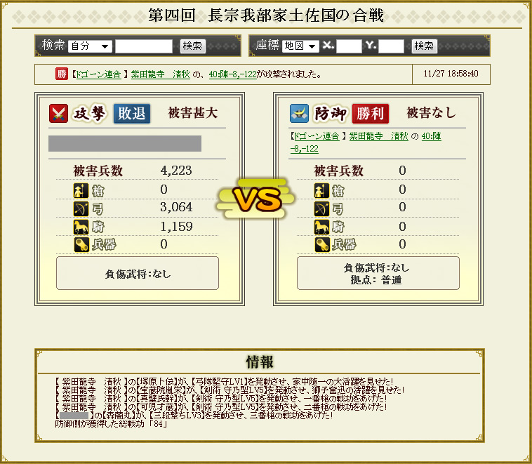 幾つかの盟主殿も陥落しており、我が殿が加盟する盟主殿の城近辺にも敵の魔手が伸びてきているようである。敵の主力は概観するに、北側、特に北西部に密集しているように見え、そこから北東、南西へと進軍を行ってるようである。南東部は比較的まだ城が残っているという事もあり、2日目の夕方からにかけて敵の猛襲を受けることが予想できる。